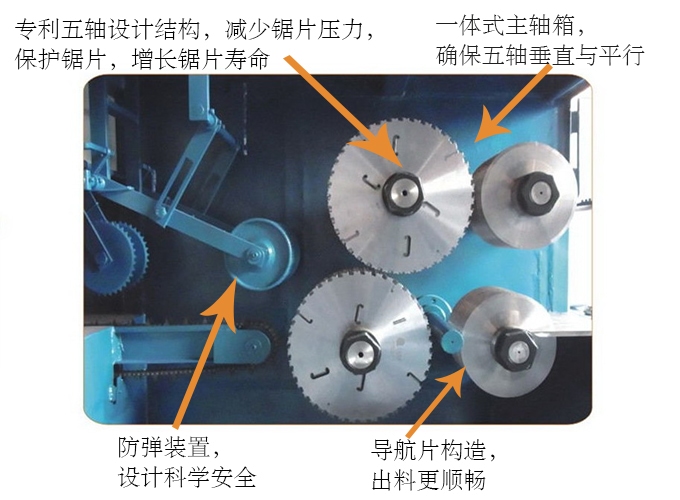 ZQ200型原木多片鋸是針對原木鋸切而設計的專用機床,采用五軸結構設計-前鋸后導航確保木板的精確度,無論木板長短均可保證鋸切木材尺寸公差在0.2mm-0.5mm之內(nèi),尺寸標準偏差小,節(jié)約木料,上下鋸軸,鋸片采用進口帶刮刀鋸片,鋸切表面光滑,無需再刨,保證不燒鋸片。采用自動分中裝置,提高木材的利用率;上壓輥主動增加壓力,送料平穩(wěn);軸心噴水冷卻鋸片,去脂降溫,增強鋸片的使用壽命。一次多片,大大提高工效;