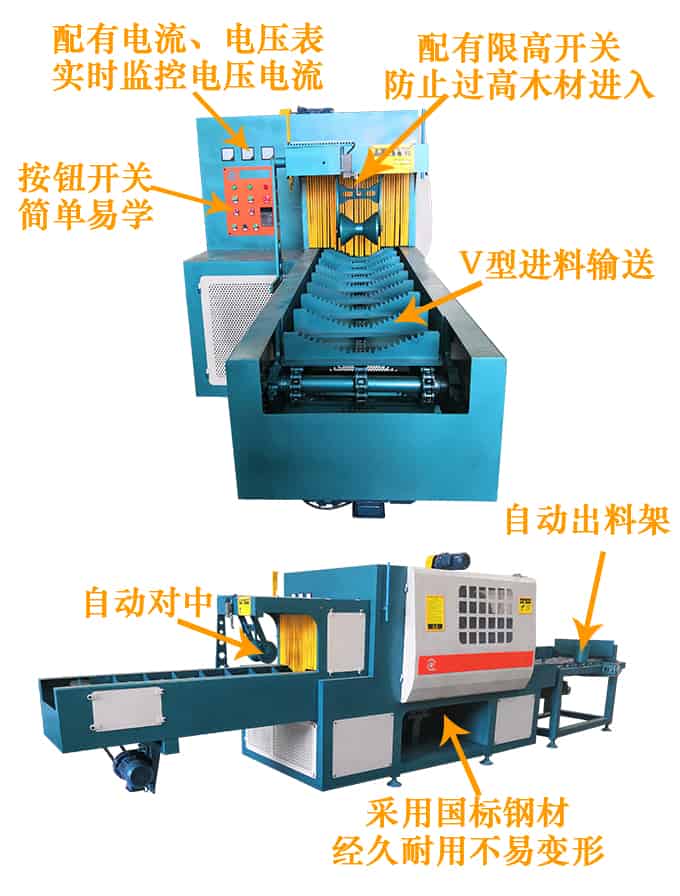 送 料:采用優質鏈條輸送,機上配有的變頻智能調速器,可以對大小木料的進料速度實行自由調速。原木可以實現自動分中,機上還配有限位開關,防止超去規格木料進入,防止卡木避免對機器造成損壞。