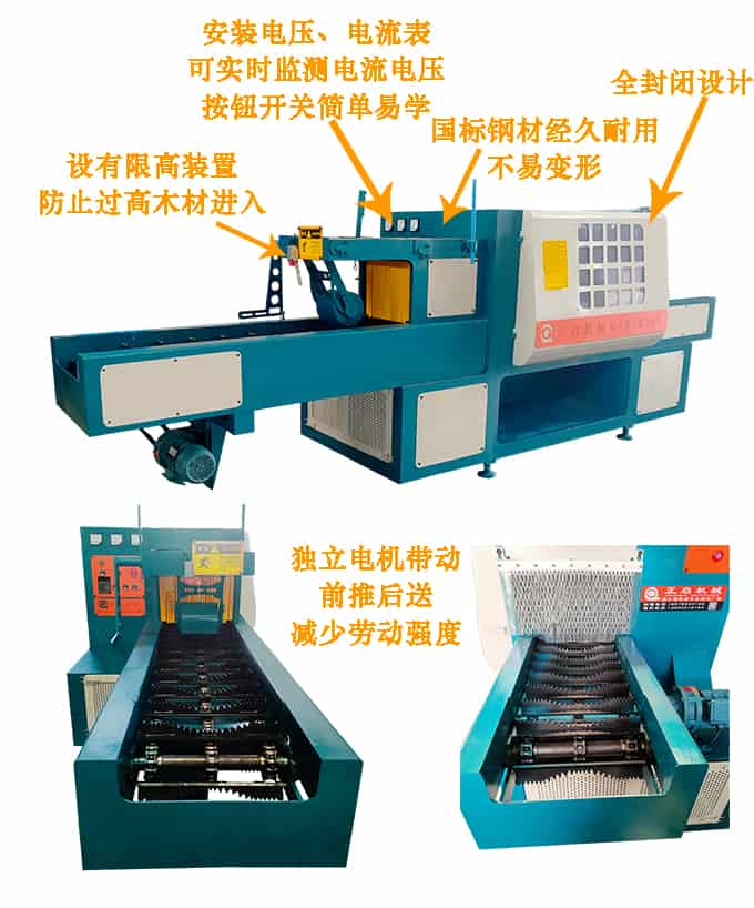 送 料:采用四排尖齒鏈條輸送,機上配有的變頻智能調速器,可以對大小木料的進料速度實行自由調速。原木可以實現自動分中,機上還配有限位開關,防止超去規格木料進入,防止卡木避免對機器造成損壞。