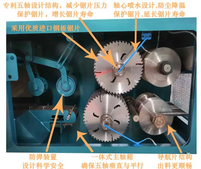 ZQ350型原木多片鋸是針對原木鋸切而設計的專用機床,采用五軸結構設計-前鋸后導航確保木板的精確度,無論木板長短均可保證鋸切木材尺寸公差在0.2mm-0.5mm之內,尺寸標準偏差小,節約木料,上下鋸軸,鋸片采用進口帶刮刀鋸片,鋸切表面光滑,無需再刨,保證不燒鋸片。采用自動分中裝置,提高木材的利用率;上壓輥主動增加壓力,送料平穩;軸心噴水冷卻鋸片,去脂降溫,增強鋸片的使用壽命。一次多片,大大提高工效;