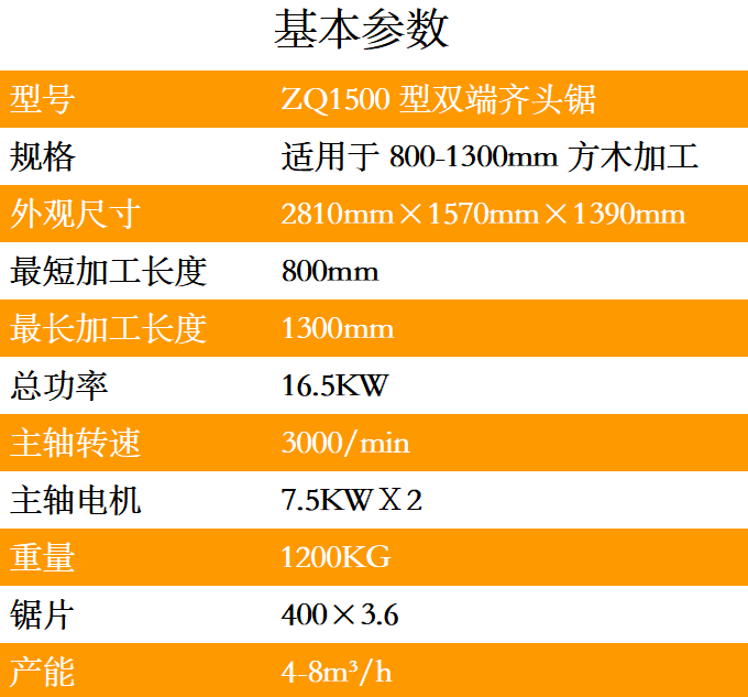 ZQ1500型雙端齊頭鋸一體式機身設計、采用國標鋼材、結構科學、操作簡單、鋸面光滑、誤差小、效率高、故障率低、維護簡單、速度可調,鋸切尺寸可調,最短0.8米,最長1.3米,中間尺寸可隨意調節